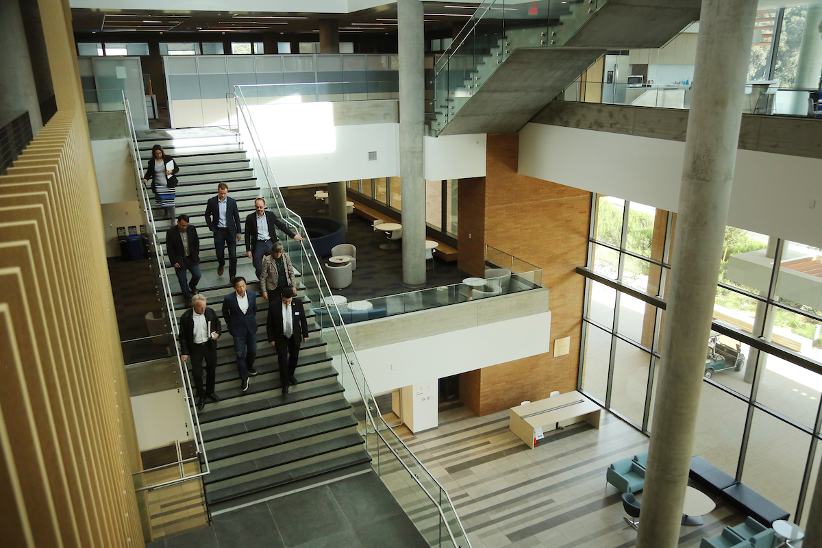 Researchers walking down stairs